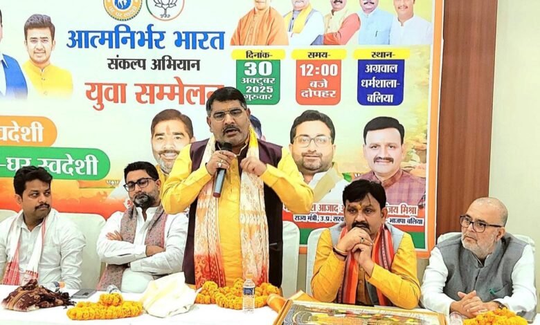 बलिया।भाजपा युवा मोर्चा ने आत्मनिर्भर भारत संकल्प अभियान के तहत युवा सम्मेलन का आयोजन अग्रवाल धर्मशाला में किया गया। सैकड़ो युवा कार्यकर्ताओं ने भाग लिया और आत्मनिर्भर भारत के निर्माण का संकल्प लिया। मुख्य अतिथि क्षेत्रिय अध्यक्ष शाहजानन्द राय ने युवाओं को संबोधित करते हुए कहा कि वर्तमान में भारत की अर्थव्यवस्था विश्व में चौथे स्थान पर है। युवाओं की सक्रिय भागीदारी से इसे भविष्य में प्रथम स्थान पर लाया जा सकता है। जोर दिया कि आत्मनिर्भर भारत का लक्ष्य तभी प्राप्त होगा जब देश के युवा स्वदेशी उत्पादों को बढ़ावा देंगे और नवाचार की दिशा में अग्रसर होंगे। भाजपा जिलाध्यक्ष संजय मिश्रा ने युवाओं को 12 बिंदुओं पर आधारित एक संकल्प दिलाया। इस संकल्प में आत्मनिर्भर भारत के निर्माण, स्वदेशी उत्पादों को अपनाने, उद्योगों को प्रोत्साहन देने और समाज सेवा के क्षेत्र में सक्रिय रहने का आह्वान किया । विधानसभा क्षेत्रों से आए युवा कार्यकर्ताओं ने प्रधानमंत्री नरेंद्र मोदी ऐप खोलें भारत के संकल्प को सफल बनाने का प्रण लिया। मंत्री दानिश आजाद अंसारी ने कहा कि युवाओं से देश में निर्मित उत्पादों का उपयोग करने और उनके प्रचार-प्रसार को बढ़ावा देने का संकल्प लेने का आह्वान किया, ताकि नए रोजगार के अवसर पैदा हों। देश की लगभग 27 प्रतिशत जनसंख्या युवाओं की है। जिन्हें आत्मनिर्भर बनाकर देश को सामाजिक और आर्थिक रूप से विकसित किया जा सकता है। प्रधानमंत्री के 2047 तक विकसित भारत के संकल्प को युवा पीढ़ी ही पूरा कर सकती है। देश की लगभग 27 प्रतिशत जनसंख्या युवाओं की है, जिन्हें आत्मनिर्भर बनाकर देश को सामाजिक और आर्थिक रूप से विकसित किया जा सकता है।अध्यक्षता युवामोर्चा के जिलाअध्यक्ष अश्वनी सिंह लिटील तथा संचालन सुरज सिंह ने किया।इस मौके पर सुरेन्द्र सिंह ,संजीव कुमार डम्पू,डा.धर्मेन्द्र सिंह,मयंक शेखर,सोनी तिवारी आदि लोग उपस्थीत थे।