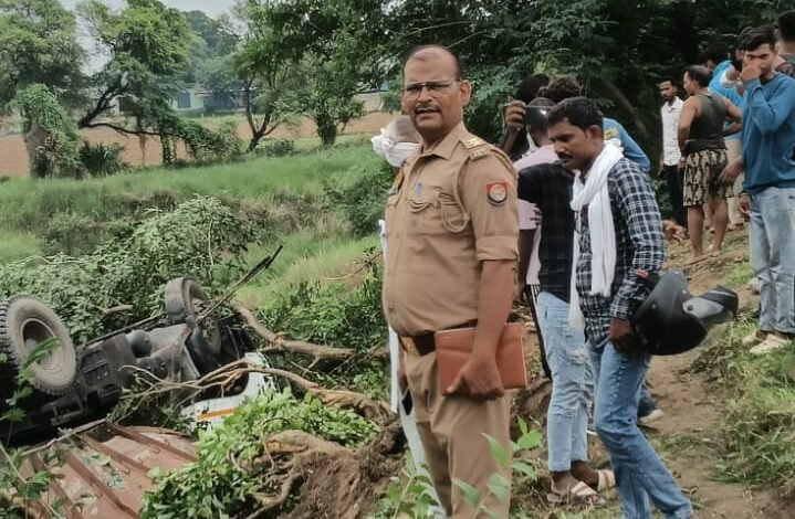 गाजीपुर:तेज रफ़्तार से अनियंत्रित होकर गड्ढे मे पलटा ट्रेलर, ड्राइवर खलासी बाल बाल बचे