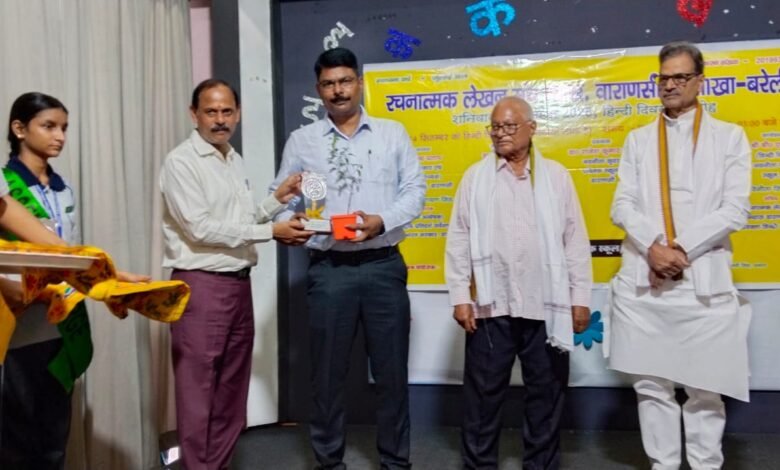 सुशील कुमार मिश्र/ वाराणसी। नवनीता कुंअर पब्लिक स्कूल सुसुवाही स्थित परिसर में रचनात्मक लेखन मंच न्यास वाराणसी उप शाखा बरेली के सौजन्य से हिंदी दिवस कार्यक्रम का आयोजन किया गया। कार्यक्रम का शुभारंभ मुख्य अतिथि डॉक्टर पृथ्वीश नाग (पूर्व कुलपति, महात्मा गांधी काशी विद्यापीठ) विशिष्ट अतिथि कार्यक्रम अध्यक्ष प्रोफेसर सुरेंद्र प्रताप (वरिष्ठ साहित्यकार एवं पूर्व हिंदी विभाग अध्यक्ष, महात्मा गांधी काशी विद्यापीठ) एवं हृदय नारायण सिंह (वरिष्ठ अन्वेक्षक) राष्ट्रीय प्रतिदर्श सर्वेक्षण संगठन भारत सरकार वाराणसी, स्कूल प्रबंधक राजेश कुमार राय, प्रधानाचार्य डॉ दिवाकर राय, उपाध्यक्ष प्रवीण के कर द्वारा मां सरस्वती के तेल चित्र के समक्ष दीप प्रज्वलन एवं पुष्प अर्पण के साथ हुआ। छात्राओं द्वारा सरस्वती वंदना नृत्य एवं स्वागत गान प्रस्तुत किया गया ।कार्यक्रम की उपस्थित सभी गणमान्य अतिथियों का स्वागत हिंदी विभाग अध्यक्ष नवनीता कुंअर पब्लिक स्कूल ने अपने स्वागत उद्बोधन से किया । इस अवसर पर बच्चों ने मनोरंजन सांस्कृतिक कार्यक्रम प्रस्तुत किया, कृतार्थ ने भाषण तथा सक्षम पांडे ने “नमो नमो जय शंकर” गीत प्रस्तुत किया। बाल कवि सम्मेलन में बच्चों ने अपनी रचनाओं के साथ अन्य कवियों की रचनाओं की ओजस्वी प्रस्तुतियां दी।प्रधानाचार्य डॉ दिवाकर राय ने इस अवसर पर अपने विचार रखते हुए कहा कि हिंदी भाषा हमारी अपनी संस्कृति की भाषा है संवाद एवं हृदय की भाषा है इस भाषा का ज्ञान एवं व्यवहार हमारे युवा पीढ़ी में होना चाहिए।मुख्य अतिथि ने अपने विचार आलोकित करते हुए बच्चों को उत्साह वर्धन किया उनकी प्रस्तुतियों की सराहना की उन्होंने बताया कि यद्यपि आज के परिवेश में अंग्रेजी का प्रचलन है परंतु हमारे आने वाली पीढियां में हमें अपनी भाषा का सम्मान करना एक संस्कार की तरह सीखना होगा, ताकि वह भविष्य में भाषा का सम्मान एवं व्यवहार करें। विशिष्ट अतिथियों ने भी बच्चों में अपनी भाषा के लिए ज्ञान एवं विधाता की बीच बोने एवं उसे वृक्ष की भांति व्यापक बनाने एवं जीवन में भाषा के माध्यम से आगे बढ़ाने की प्रेरणा बच्चों को दी। इस अवसर पर रचनात्मक लेखन समिति द्वारा प्रेषित कवियत्री मानवी सिंह ने भी अपना मनमोहन काव्य पाठ प्रस्तुत किया। विद्यालय के बच्चों ने निबंध एवं सुलेख प्रतियोगिता में उत्कृष्ट प्रदर्शन किया तथा मुख्य अतिथि एवं गणमान्य पदाधिकारी ने सभी बच्चों को पुरस्कृत किया ।कार्यक्रम में मंच संचालन छात्रा नैना एवं सृजल ने किया। शिक्षिका श्रीमती अंजू सिंह ने धन्यवाद ज्ञापन देखकर कार्यक्रम का समापन किया।