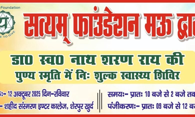 क्षेत्र के लोगों से चिकित्सा शिविर में निशुल्क इलाज कराने की अपील करते हुए जयानन्द राय ने बताया कि फाउंडेशन के निदेशक डा.सत्यानंद राय द्वारा आयोजित चिकित्सा शिविर 12 अक्टूबर दिन रविवार,स्थान—शहीद संस्मरण इण्टर कालेज शेरपुर खुर्द में आयोजित है, समस्त क्षेत्रवासियों से अनुरोध है कि अधिक से अधिक संख्या में आकर चिकित्सा शिविर का लाभ लें।