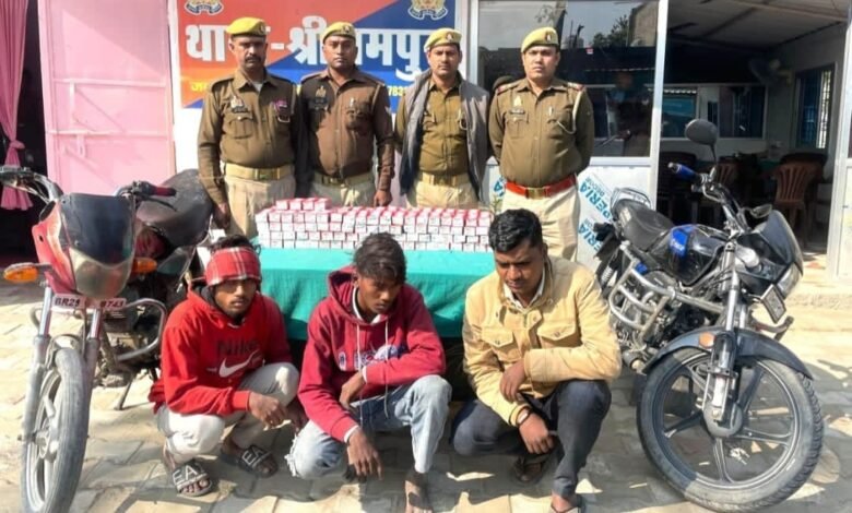 देवरिया। जनपद के पुलिस अधीक्षक संजीव सुमन द्वारा जनपद में अपराध एवं अपराधियों की रोकथाम हेतु अवैध शराब के विरुद्ध चलाये जा रहे अभियान ऑपरेशन प्रहार के क्रम में आज बुधवार को थाना श्रीरामपुर पुलिस द्वारा संदिग्ध वाहनों/व्यक्तियों की चेकिंग के दौरान मुखबिर की सूचना पर चकिया कोठी बलिवन मार्ग से दो मोटरसाइकिल प्लेटिना रजि0नं0 BR29G3743 व स्पलेण्डर रजि0नं0 BR28AF 7715 से बिहार ले जायी जा रही दो प्लास्टिक के झोले में 80-80 पाउच अवैध देशी शराब रोमियो राजा कीमत करीब 9,000/- रुपया) के साथ 03 अभियुक्तों गोविन्द पुत्र हरिशंकर राम, प्रिंस कुमार पुत्र हीरालाल राम निवासी खरौनी टोला घघरिया थाना मीरगंज जिला गोपालगंज बिहार व चन्दन विश्वकर्मा पुत्र गीताशरण विश्वकर्मा निवासी नोनापार थाना भटनी जिला देवरिया को गिरफ्तार किया गया ।पुलिस टीम द्वारा बरामद शराब व मोटरसाइकिलों को कब्जे में लेकर गिरफ्तार अभियुक्तों के विरुद्ध थाना स्थानीय पर मु0अ0सं0 -217/2025 धारा 60/72 आबकारी अधिनियम का अभियोग पंजीकृत करते हुए नियमानुसार अग्रिम विधिक कार्यवाही की जा रही है ।गिरफ्तारी करने वाली पुलिस टीम में उ0नि0 विपिन कुमार यादव, हे0का0 शहनवाज अली का0 रामनिवास सिंह, का0 अजय सिंह व का0 अजीत यादव थाना श्रीरामपुर जनपद देवरिया शामिल रहे।