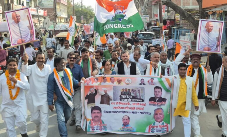 शीबू खान/फतेहपुर। केंद्र सरकार की नीतियों के विरोध और मनरेगा योजना को बचाने के उद्देश्य से कांग्रेस पार्टी द्वारा चलाए जा रहे ‘मनरेगा बचाओ संग्राम’ अभियान के तहत शुक्रवार को खागा विधानसभा क्षेत्र में ग्रामीण मजदूरों के साथ भव्य पदयात्रा निकाली गई। यह पदयात्रा ग्राम त्रिलोचनपुर से प्रारंभ होकर विभिन्न ग्रामीण क्षेत्रों से होते हुए खागा नगर पंचायत तक करीब 16 किलोमीटर लंबी रही। पदयात्रा में महिलाओं सहित बड़ी संख्या में ग्रामीणों ने भाग लिया। हाथों में तख्तियां लेकर और सरकार विरोधी व मनरेगा बचाओ के नारे लगाते हुए कार्यकर्ता नगर पंचायत पहुंचे, जहां गांधी प्रतिमा पर माल्यार्पण कर यात्रा का समापन किया गया।