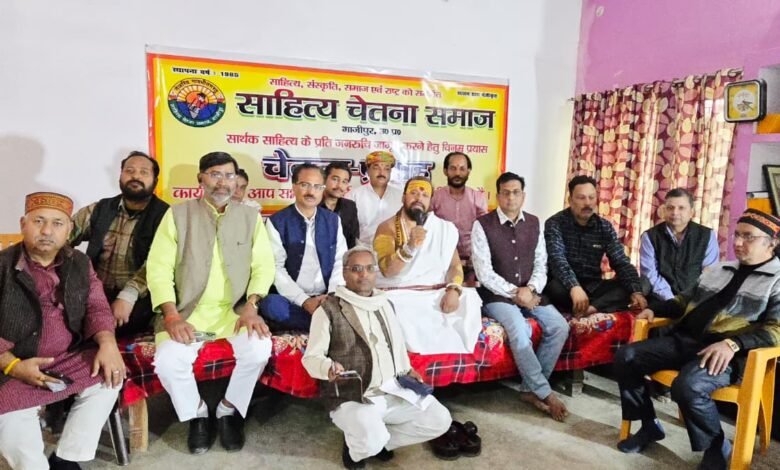 गाजीपुर : साहित्य चेतना समाज के तत्वावधान में ‘चेतना-प्रवाह’ के अन्तर्गत कवि-गोष्ठी एवं गीत-संगीत का कार्यक्रम लोकगीत गायक रामअलम सिंह मधुर के बिठौरा गाँव स्थित उनके आवास पर आयोजित हुआ। कार्यक्रम की अध्यक्षता गीता गुरुकुल फाउण्डेशन मिशिगन,अमेरिका के संस्थापक योगी आनन्द जी एवं संचालन संस्था के संस्थापक अमरनाथ तिवारी ‘अमर’ ने किया। कार्यक्रम का शुभारंभ संजय पाण्डेय की सरस्वती वंदना से हुआ। इसके बाद कवियों एवं गायकों द्वारा प्रस्तुत गीत-संगीत की रसधार में श्रोता रससिक्त होते रहे।