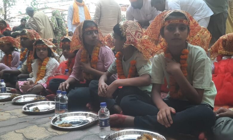 चंद्रमोहन तिवारी / गाजीपुर। चैत्र नवरात्र के महाअष्टमी के दिन दुर्गा के नवरूपो मे महागौरी के आराधना का पर्व सनातन धर्म में धूमधाम में मनाया जा रहा है। इस पर्व को लेकर राष्ट्रीय स्वयंसेवक संघ कार्यालय रायगंज स्थित केशव कुटी भवन पर अष्टमी के दिन मां दुर्गा के महागौरी रूप की प्रतीक 108 कन्याओ का विधिवत पूजन कर व्यजनों का भोग लगाया गया। इस अवसर पर जिला प्रचारक प्रभात ने बताया कि चैत्र नवरात्रि में शक्ति की आराधना मां दुर्गा के विभिन्न नवरूपो हम दर्शन पूजन करते है, नवरात्रि के प्रथम दिन मां शैलपुत्री की पूजा के साथ नववर्ष की शुरूआत करते है और ब्रम्हचारिणी, चन्द्रघंटा, कुष्माण्डा, स्कंदमाता, कात्यायनी, कालरात्रि, महागौरी की पूजा अष्टमी को सम्पूर्ण भारत में मनाया जा रहा है, सभी नवदेवी के नवरूपो की आराधना नौ दिनो तक उपासना किया जा रहा है पंण्डित विनोद तिवारी ने अष्टमी अनुष्ठान मे यज्ञपूजन किया तत्पश्चात 108 कन्याओ को विधिवत पैर धोकर, महावर व कुमकुम, तिलक लगाकर कल्पना जायसवाल ने सभी कन्याओ का आरती पूजन किया गया ओैर मातृशक्ति के माध्यम से कन्याओ को पूजन किया गया। इस कन्या पूजन में विभिन्न आनुषागिक संगठन के कार्यकर्ताओ ने अपना पूजन में सहयोग प्रदान किया। जिसमें जिला संचालक जयप्रकाश, सह विभाग प्रचारक प्रेमप्रकाश, अभाविप के संगठन मंत्री विपुल, विभाग सम्पर्क प्रमुख अशोक, नगर संघचालक दीनदयाल, मुन्ना, वरिष्ठ नेता कृष्ण बिहारी राय, नितिन अग्रहरि, पियुष राय, अमित तिवारी, विनोद तिवारी, अधिवक्ता अखिलेश सिंह, राजेश, मोहन, दुर्गेश, गिरधर, दाऊ जी, अमित ंिसह, कृष्णा आदि सैकड़ो लोग उपस्थित रहे।