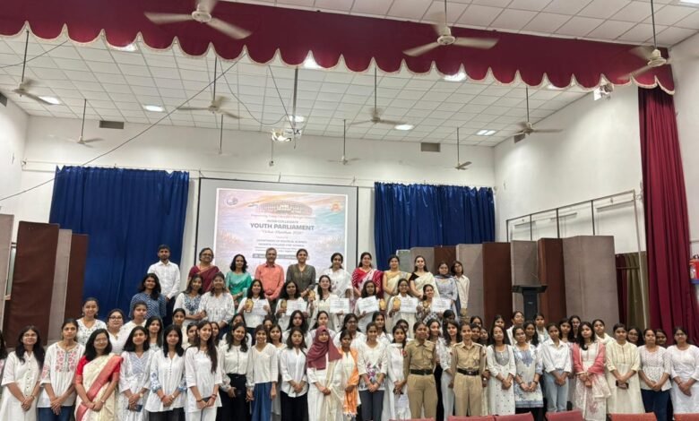 इस अवसर पर वरिष्ठ पत्रकार श्री विश्वनाथ गोकर्ण के आशीर्वचन के साथ सत्र का शुभारंभ हुआ। उन्होंने छात्राओं को संबोधित करते हुए कहा कि युवा संसद जैसे मंच लोकतांत्रिक मूल्यों को समझने और अभिव्यक्ति कौशल को विकसित करने का सशक्त माध्यम हैं। उन्होंने छात्राओं को समसामयिक विषयों पर सजग एवं जिम्मेदार नागरिक बनने के लिए प्रेरित किया। जिसके पश्चात युवा संसद सत्र आयोजित किया गया। युवा संसद में प्रमुख रूप से Middle East Crisis and Indian Responses, AI एवं ICT Governance (Digital Protection संदर्भ), US के साथ Tariff War एवं Trade Deal, नई शिक्षा नीति (NEP) का क्रियान्वयन एवं Higher Education Framework, तथा SDGs Vikshit Bharat@2047 जैसे महत्वपूर्ण विषयों पर चर्चा की गई। विभिन्न महाविद्यालयों के प्रतिभागियों—समृद्धि सिन्हा, माही सिंह, श्रेया साक्षी, अनुश्री दास, नीलाक्षी दुबे, खुशी शुक्ला, निष्ठा मौर्य, पूर्णिमा सेठ, सृष्टि नायक, चेतना श्री सहित अन्य छात्राओं—ने प्रभावशाली ढंग से अपने विचार प्रस्तुत किए।