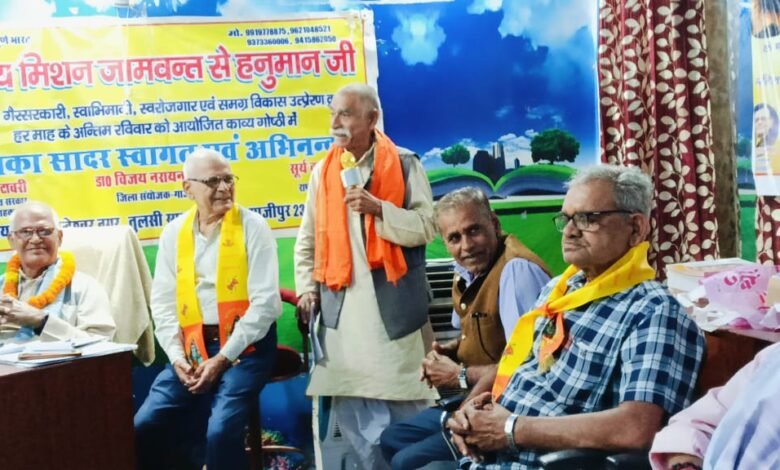 जिनसे प्रेरणा लेते हुए।पत्रकारिता,समाज सेवा, शिक्षा और कृषि के क्षेत्र में सर्वांगीण विकास के लिए मिशन जामवंत से हनुमानजी बड़े बुजुर्गो के दिशा-निर्देशन में युवाओं और बच्चों को हनुमानजी की सेना की तरह शहरी एवं ग्रामीण क्षेत्रों में संगठित करके सबके सुख समृद्धि के लिए हम सब प्रयत्नशील हैं। अध्यक्षीय संबोधन में डा. व्यास मुनि राय ने कहा कि मानव से मानव का हो सच्चा भाईचारा, यही सोच समझ लेकर चलने का सद विचार हो हमारा। स्वागत संयोजन – डॉ. विजय नारायण तिवारी एवं धन्यवाद आभार सूर्यकुमार सिंह ने किया।