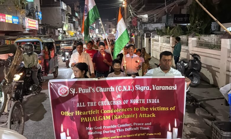 वाराणसी। आज शनिवार को सेंट पॉल चर्च सिगरा और ईसाई समाज ने पहलगाम में हुए आतंकी हमले की कड़े शब्दों में निन्दा करते हुए विरोध में कैंडल मार्च निकाला। इस मार्च में विभिन्न वर्गों के लोग शामिल हुए।