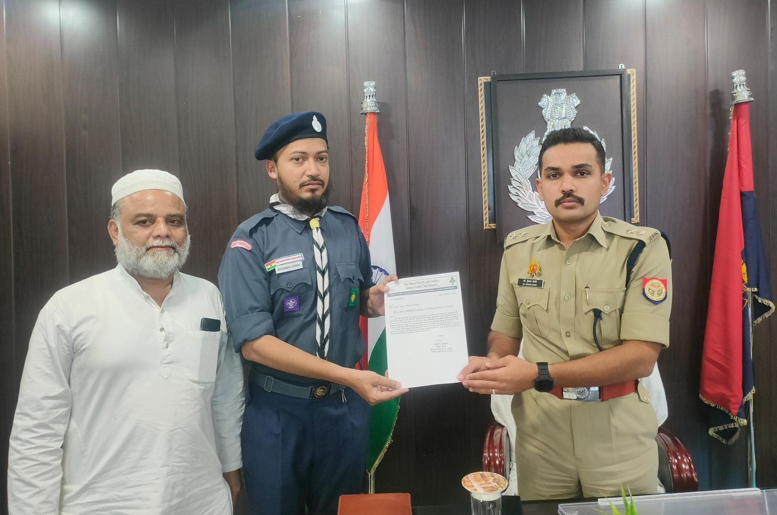 वाराणसी। भारत स्काउट्स एंड गाइड्स जमीयत यूथ क्लब बनारस का एक प्रतिनिधिमंडल सहायक पुलिस आयुक्त भेलूपुर एवं सहायक पुलिस आयुक्त रिज़र्व पुलिस लाइन कमिश्नरेट वाराणसी IPS डॉक्टर ईशान सोनी से मिला तथा सहायक पुलिस आयुक्त के माध्यम से पुलिस आयुक्त कमिश्नरेट वाराणसी को संबोधित एक ज्ञापन दिया जिसमें अपने केंद्रीय नेतृत्व विशेष रूप से मौलाना महमूद मदनी (मुख्य आयुक्त जमीयत यूथ क्लब) की इस प्रतिबद्धता को दोहराया गया कि इस समय पूरा देश एवं विशेष रूप से देश का मुसलमान अपनी फौज के साथ चट्टान की तरह खड़ा हैं और देश के लिए किसी भी तरह की कुर्बानी देने के लिए हम तैयार हैं। हाफ़िज़ ओबैदुल्लाह (अध्यक्ष जमीयत यूथ क्लब बनारस ने जो कि शहर से बाहर हैं) फोन के माध्यम से ये कहा कि इस विषम परिस्थिति में जमीयत यूथ क्लब का एक एक सदस्य न सिर्फ अपने राष्ट्र के साथ है बल्कि राष्ट्र की सेवा के लिए तत्पर है। जमीयत यूथ क्लब बनारस के सचिव मुहम्मद रिज़वान ने ACP से संवाद में ये बात कही कि यद्यपि हमारे युवा कम आयु के हैं परंतु उनका हृदय राष्ट्र सेवा के भाव से परिपूर्ण है। ACP डॉक्टर ईशान सोनी ने इन बातों को ध्यानपूर्वक सुना और प्रसन्नता व्यक्त की साथ ही साथ ये कहा कि हमें आवश्यकता पड़ने जल्द ही बुलाया जा सकता है। जमीयत यूथ क्लब के वरिष्ठ सदस्य हाजी शाहिद जमाल ने कहा कि इन परिस्थितियों में यदि हमें राष्ट्र की सेवा का अवसर प्राप्त होता है तो ये हमारे लिए गौरव का विषय होगा।