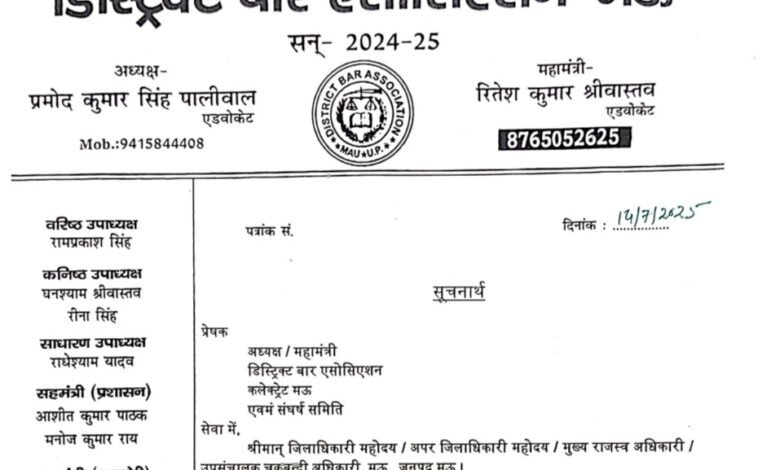मऊ। जिले में लंबे समय से न्यायिक कार्य ठप कर हक और सम्मान की लड़ाई लड़ रहे अधिवक्ताओं को बड़ी सफलता मिली है। डिस्ट्रिक्ट बार एसोसिएशन के नेतृत्व में चल रहे आंदोलन के बाद प्रशासन ने बड़ा एक्शन लिया। जिलाधिकारी प्रवीण मिश्र द्वारा संबंधित अधिकारियों का तबादला किए जाने के बाद अधिवक्ताओं ने हड़ताल समाप्त करने का निर्णय लिया है। अब 15 मई से जिले की सभी तहसीलों में न्यायिक कार्य पूरी तरह से बहाल हो जाएगा।डिस्ट्रिक्ट बार एसोसिएशन के अध्यक्ष प्रमोद कुमार पालीवाल की अध्यक्षता में कलेक्ट्रेट बार पुस्तकालय में आयोजित अहम बैठक में यह निर्णय लिया गया कि अधिवक्ताओं के सम्मान और न्यायिक मर्यादा की रक्षा के लिए भविष्य में भी इसी प्रकार एकजुटता दिखाई जाएगी। बैठक का संचालन महामंत्री रितेश कुमार श्रीवास्तव ने किया।